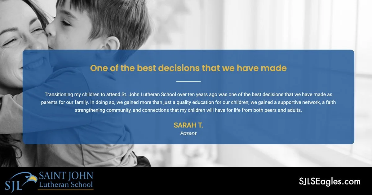 St. John Lutheran offers tours of their campus. See How St. John Lutheran School has been developing purpose-driven leaders who are recognized not just by their academic excellence in the classroom, but by their values and character in every area of life.